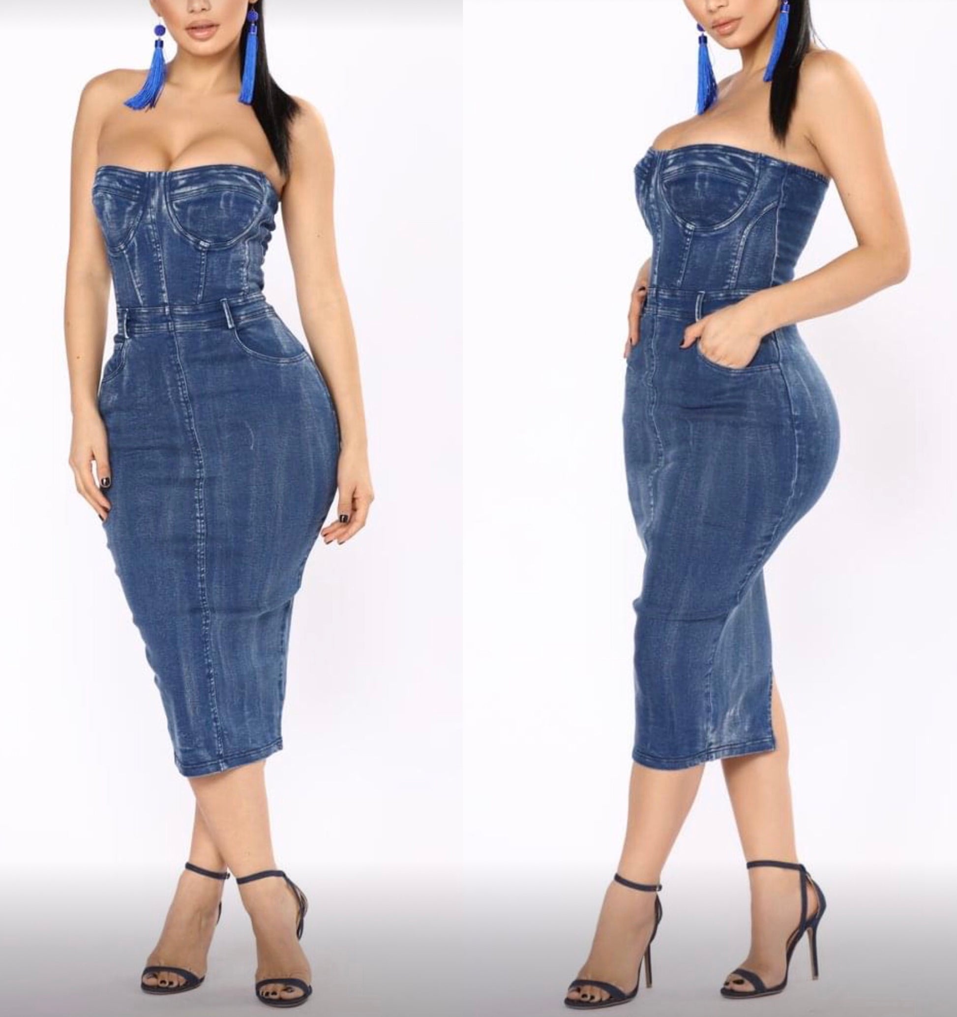 She's been loved once - but she's ready to serve again. This preloved strapless denim midi is everything:
